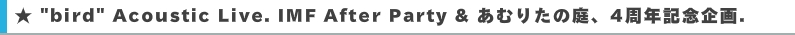 2011年、6月に行なわれた "あむりたの庭、そして音楽"での超プレミアムな完全限定35名の bird Acoustic Live!!!その興奮も冷めやらぬまま、2012年の西表ミュージックフェスティバルへの参加 & あむりたの庭、4周年記念として、birdの再来島が決定しました!!!!!